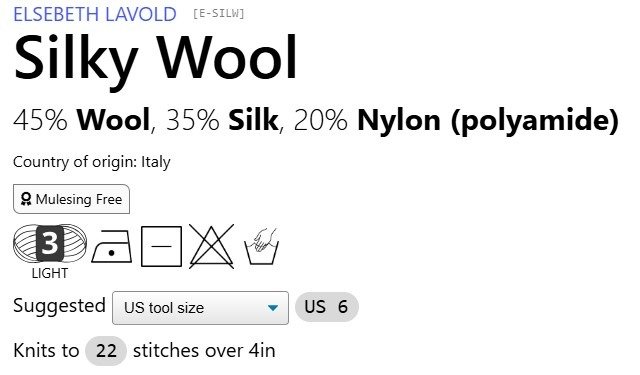 "Silky Wool is a long time favorite with a light nubby twist. This wonderful 45% Wool, 35% Silk, 20% Nylon knits to a DK weight gauge and creates a fabric that is lightweight, but warm. Silky Wool is a great choice when you are knitting or crocheting multi-season garments." (Quoted from Knitting Fever)